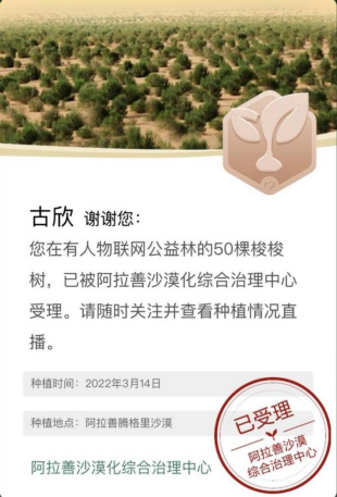 烏蘭布和沙漠是阿拉善沙漠境內(nèi)的三大沙漠之一,緊挨著黃河寧蒙河道,對黃河流域的生態(tài)環(huán)境有著巨大的影響。此次植樹活動(dòng)是有人物聯(lián)網(wǎng)對綠色環(huán)境、綠色生態(tài)的守護(hù),更是對國家黃河流域生態(tài)保護(hù)和高質(zhì)量發(fā)展戰(zhàn)略的響應(yīng),彰顯了“有人”發(fā)展的綠色公益理念和社會(huì)責(zé)任擔(dān)當(dāng)。在本次云植樹活動(dòng)中,公司員工踴躍參與,共認(rèn)養(yǎng)50棵梭梭樹,并以有人物聯(lián)網(wǎng)的名義捐贈(zèng)、種植在阿拉善沙漠,為西部地區(qū)沙漠化治理化、綠化改造貢獻(xiàn)力量。