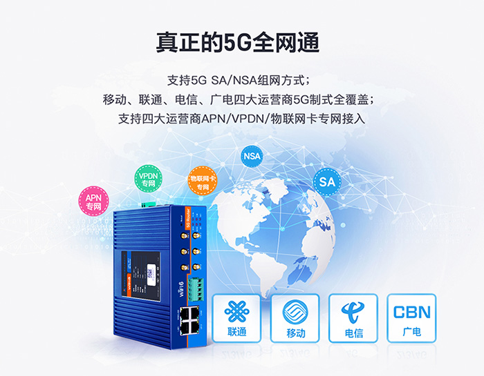 工業(yè)路由器是一種通過蜂窩無線網(wǎng)絡(luò)為用戶提供無線的數(shù)據(jù)傳輸功能。通常工業(yè)路由器支持移動、聯(lián)通、電信三大運營商,而有人5G工業(yè)路由器在此基礎(chǔ)上,還支持廣電運營商。是四大運營商的全網(wǎng)通工業(yè)路由器。
