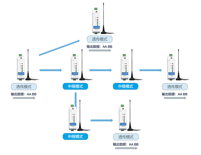 使用LoRa數(shù)據(jù)傳輸不再擔(dān)心現(xiàn)場環(huán)境障礙物多、傳數(shù)距離達(dá)不到需求的問題,中繼功能可運(yùn)行多個中繼網(wǎng)絡(luò),模塊自動轉(zhuǎn)發(fā),增加無線傳輸距離,適用超遠(yuǎn)距離或障礙物較多環(huán)境下通訊。