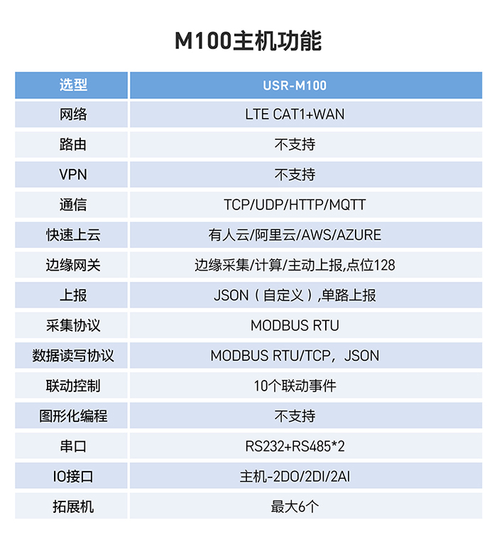 面對(duì)既需要IO進(jìn)行采集、控制現(xiàn)場設(shè)備,又需要DTU進(jìn)行數(shù)據(jù)透傳的場景時(shí),我們通常需要同時(shí)采購DTU和IO產(chǎn)品組合使用,還要考慮DTU與IO設(shè)備的兼容性,產(chǎn)品選型+調(diào)試繁瑣。M100不僅支持DTU與IO的功能,還能夠支持邊緣采集和計(jì)算,當(dāng)邊緣設(shè)備過多時(shí),邊緣計(jì)算與邊緣采集能大大減輕服務(wù)器壓力!
