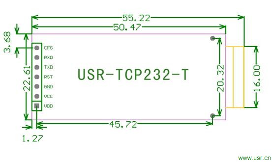 型號說明:USR 表示有人科技,及我公司品牌,TCP232表示TCPIP轉串口模塊系列產(chǎn)品,2/4/T表示串口端電平形式。