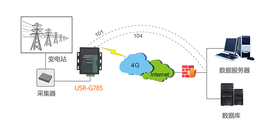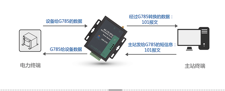 按照電力101協(xié)議傳輸數(shù)據(jù),DTU作為子站端的一部分,只需將數(shù)據(jù)通過串口發(fā)給DTU,USR-G785就會(huì)將101報(bào)文發(fā)送給服務(wù)器。