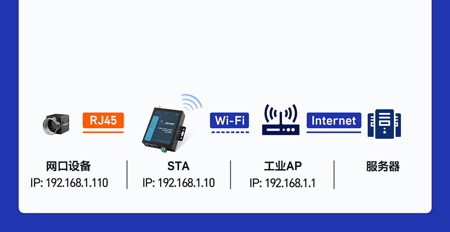 USR-w630作為STA使用,通過Wi-Fi連接其他AP設(shè)備(如路由器),實(shí)現(xiàn)