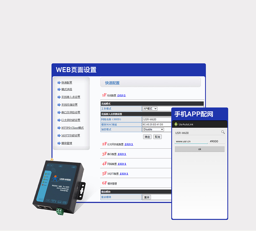 WEB頁(yè)面配置/遠(yuǎn)程升級(jí)、串口/網(wǎng)絡(luò)AT指令配置、手機(jī)APP配網(wǎng)。