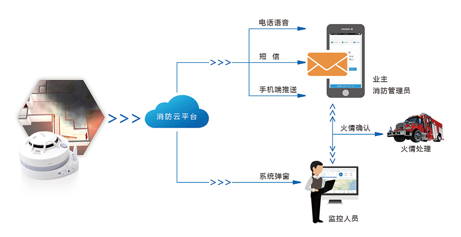 有人物聯(lián)網(wǎng)智慧消防云平臺(tái)通過電話自動(dòng)語音、短信、手機(jī)端等多種形式,及時(shí)將火災(zāi)告警信息推送至業(yè)主和消防管理員,并同時(shí)發(fā)送短信、輪播語音通知相關(guān)聯(lián)系人�;鹁ㄖ獙⒌谝粫r(shí)間在管理監(jiān)控平臺(tái)彈窗提醒,監(jiān)控人員可第一時(shí)間通過平臺(tái)查找聯(lián)系方式通知業(yè)主確認(rèn)火情。
