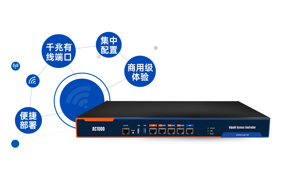AC1000 | 無線AC控制器 商用無線控制器, 集中管理無線AP, 集中管理無線用戶 AC1000系具有本地中小型局域網(wǎng)集中配置、管理和狀態(tài)監(jiān)控功能并集成有線設(shè)備統(tǒng)一管理功能的控制器。既支持AC功能,如無線AP管理、無線上網(wǎng)控制、無線認證管理、無線安全管理,也支持網(wǎng)絡集中控制功能,如整網(wǎng)智能開局、全網(wǎng)集中管理、設(shè)備自動發(fā)現(xiàn)和網(wǎng)絡運維等。產(chǎn)品的WAN口、LAN口均采用千兆有線端口設(shè)計,相比傳統(tǒng)百兆端口,有線傳輸速率提高十倍,適合100M以上的光纖寬帶接入,能夠滿足國內(nèi)主流的光纖接入帶寬。