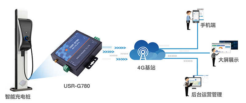 1、將4G DTU USR-G780嵌入充電樁,連接控制系統(tǒng),為設(shè)備提供4G聯(lián)網(wǎng)功能