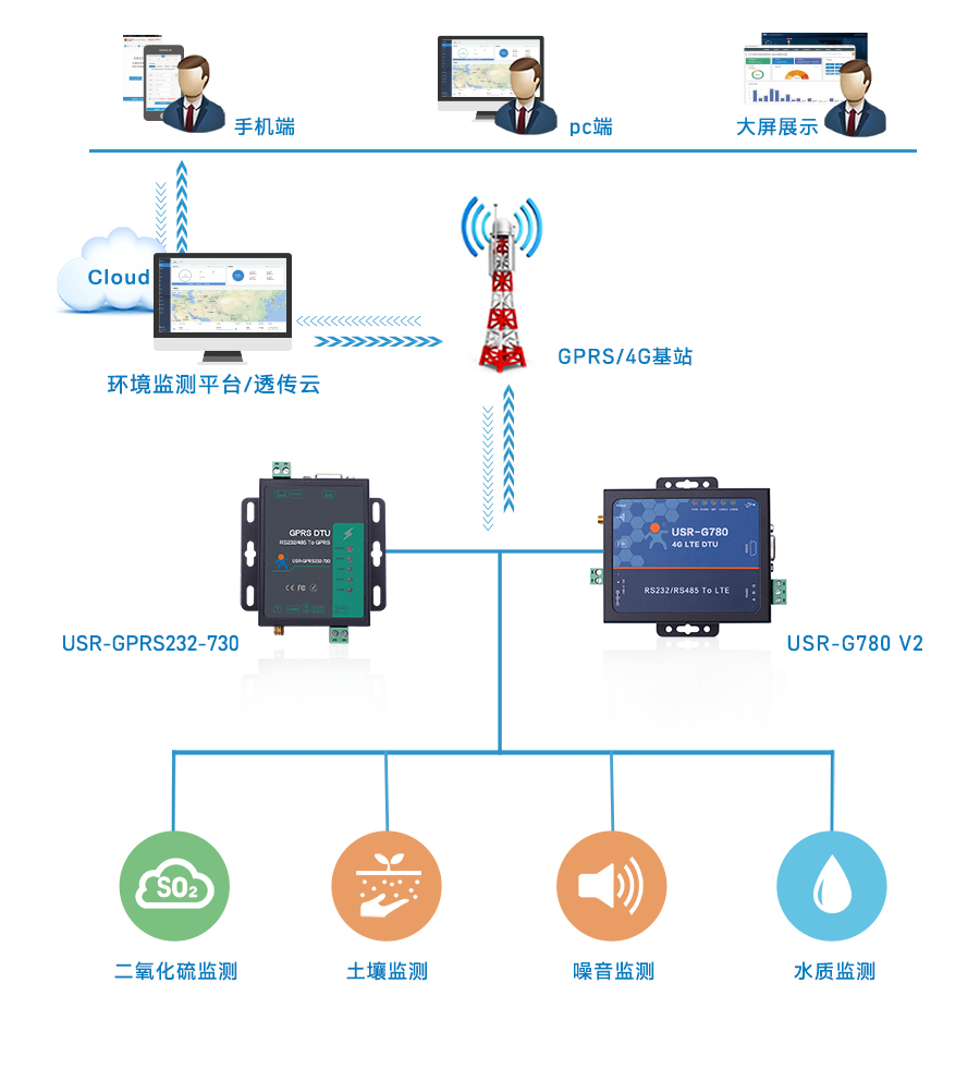 (1)環(huán)保項目運營商,利用有人GPRS/4G DTU與終端傳感器相連接