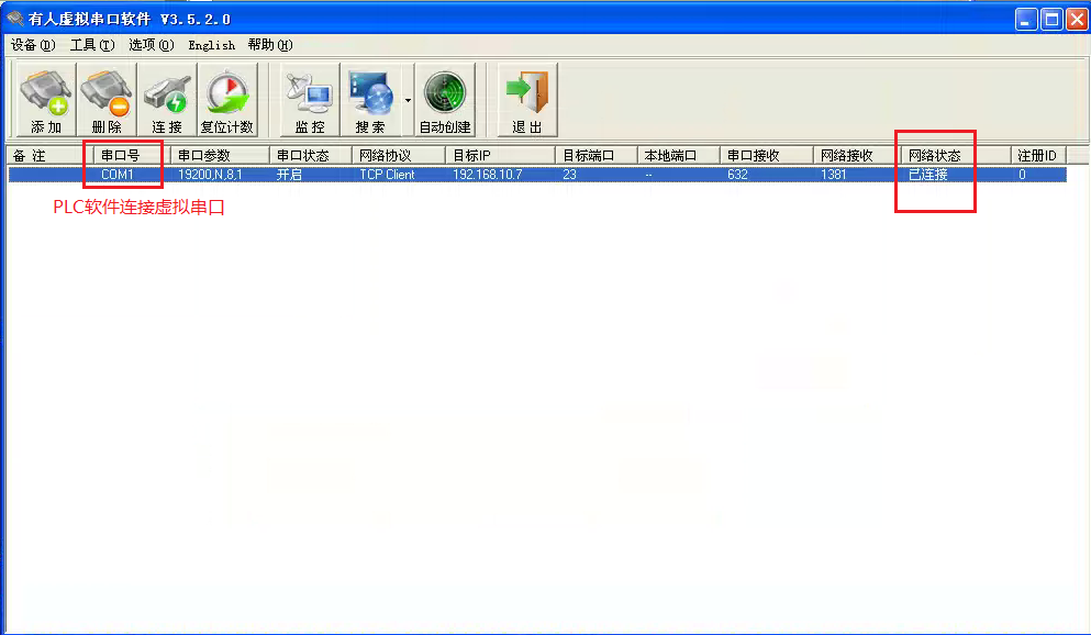 3:PLC串口直連電腦通信測(cè)試成功,將PLC連接串口服務(wù)器串口,使用串口服務(wù)器配合虛擬串口軟件通信。添加虛擬串口,設(shè)置串口服務(wù)器參數(shù)。