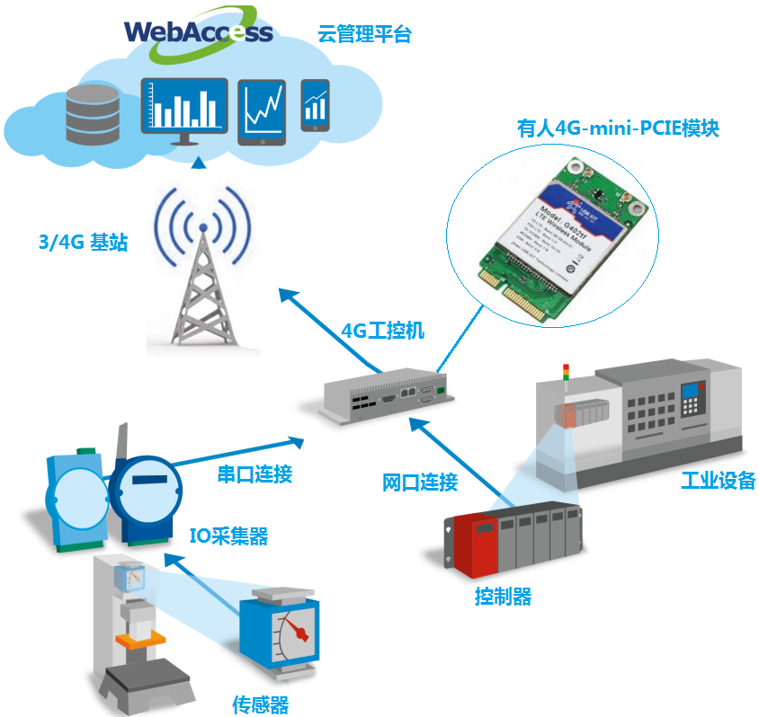 1:實(shí)現(xiàn)功能:研華工控機(jī),內(nèi)部自帶mini-PCIE接口,內(nèi)部可以插接mini-PCIE接口的WiFi和4G模塊,實(shí)現(xiàn)工控機(jī)的聯(lián)網(wǎng)。連接上4G模塊后,工控機(jī)不用連接寬帶網(wǎng)絡(luò)即可實(shí)現(xiàn)工控機(jī)上網(wǎng),可以把現(xiàn)場的數(shù)據(jù)發(fā)送到遠(yuǎn)端工控云管理平臺(tái)上。