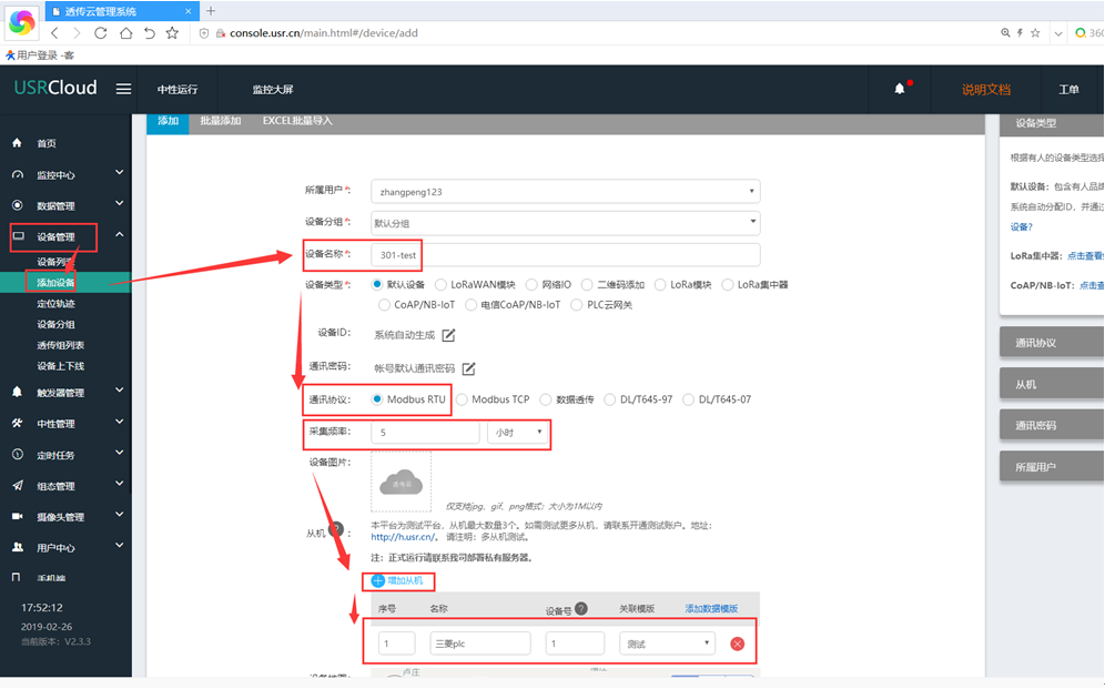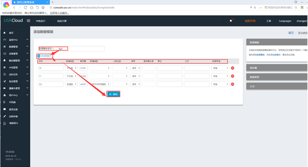 2、登錄云平臺(tái),添加設(shè)備和數(shù)據(jù)模板