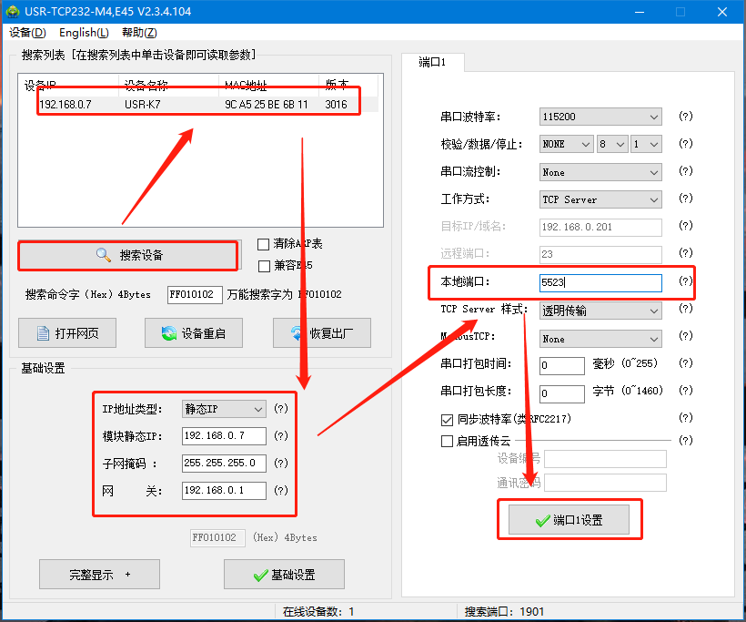4、打開設置軟件,點擊“搜索設備”當搜索列表中出現(xiàn)K7的設備后,點擊搜索到的設備,模塊工作方式設為TCP SERVER,本地端口5523,點擊保存參數(shù)。