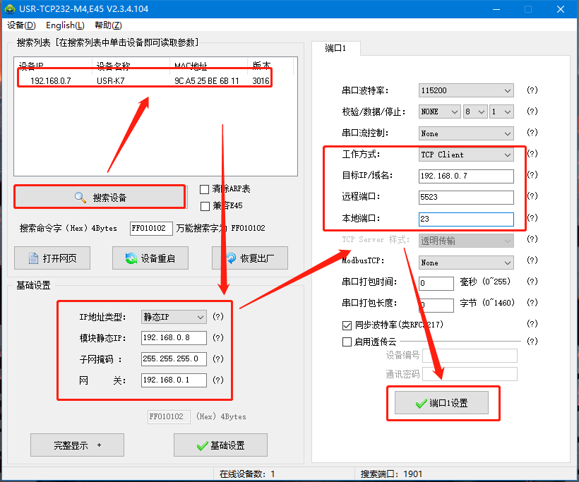5、點擊“搜索設備”當搜索列表中出現(xiàn)另一臺K7的設備后,點擊搜索到的設備,為了防止IP沖突,將此設備IP修改為192.168.0.8,模塊工作方式設為TCP Client,本地端口0,遠程端口5523,點擊保存參數(shù)。