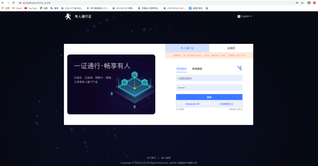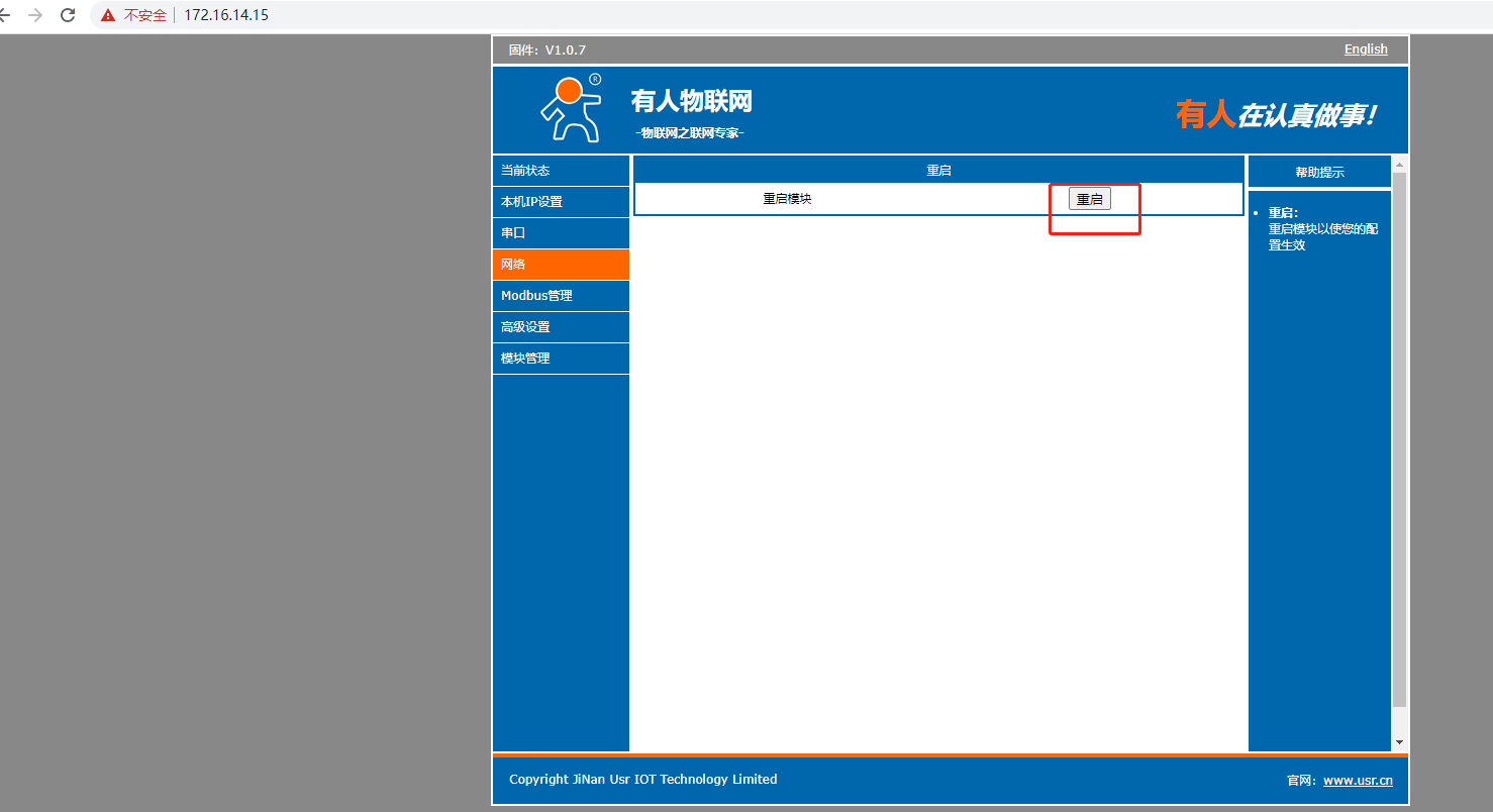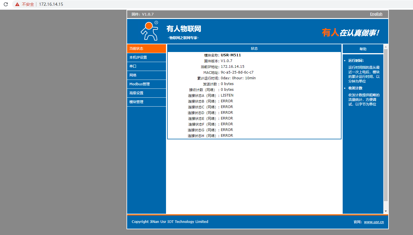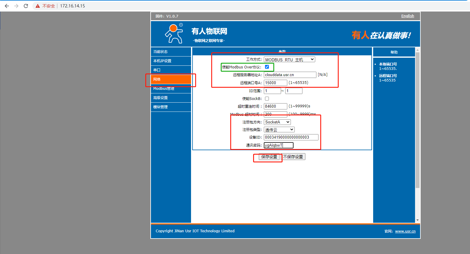 7.設置串口的參數(shù),工作方式選擇MODBUS RTU主機,遠程服務器地址:clouddata.usr.cn,遠程端口:15000。一定要勾選MODBUS OVER協(xié)議。