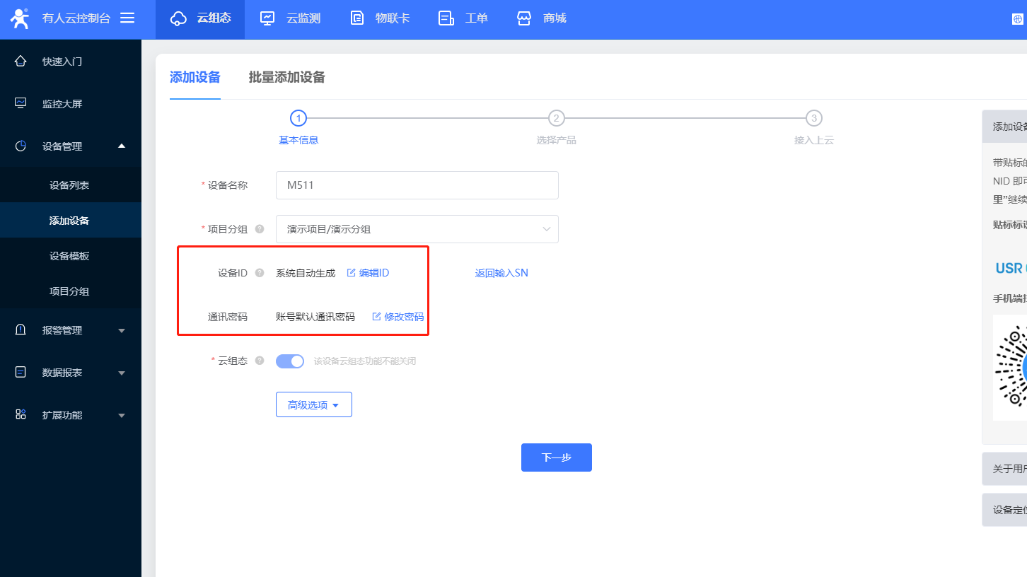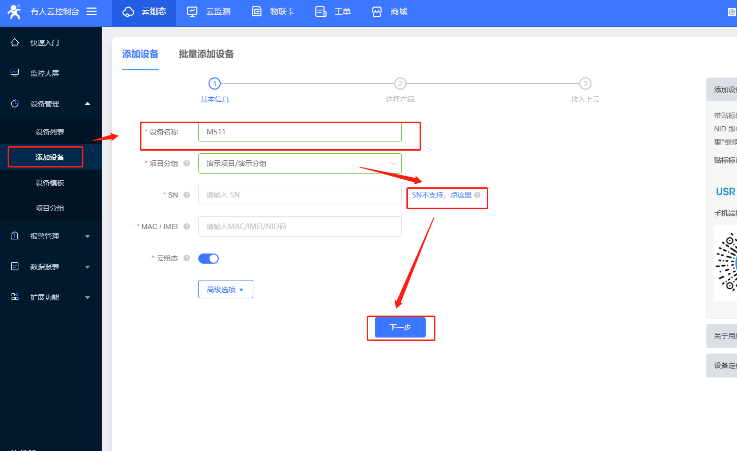 (2)M511不支持SN添加,點擊右側(cè)沒有SN,默認自動生成設備編號和通信密碼