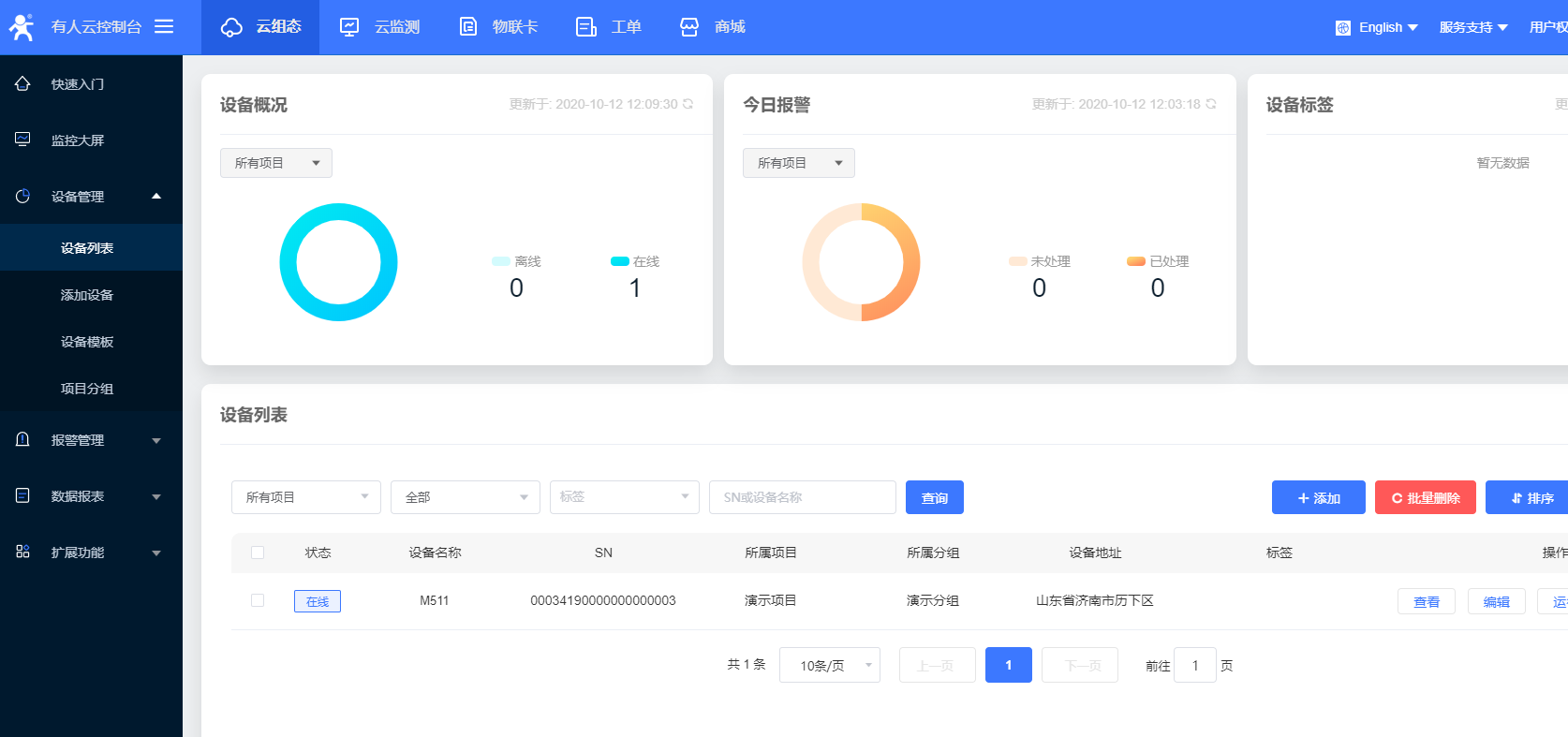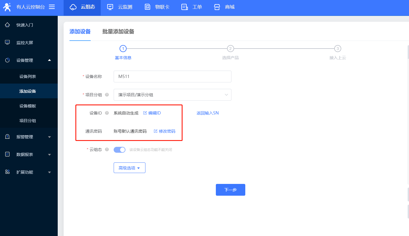 5.可以在這里看到默認生成的設備編號和通信密碼,點擊完成,云端成功添加設備