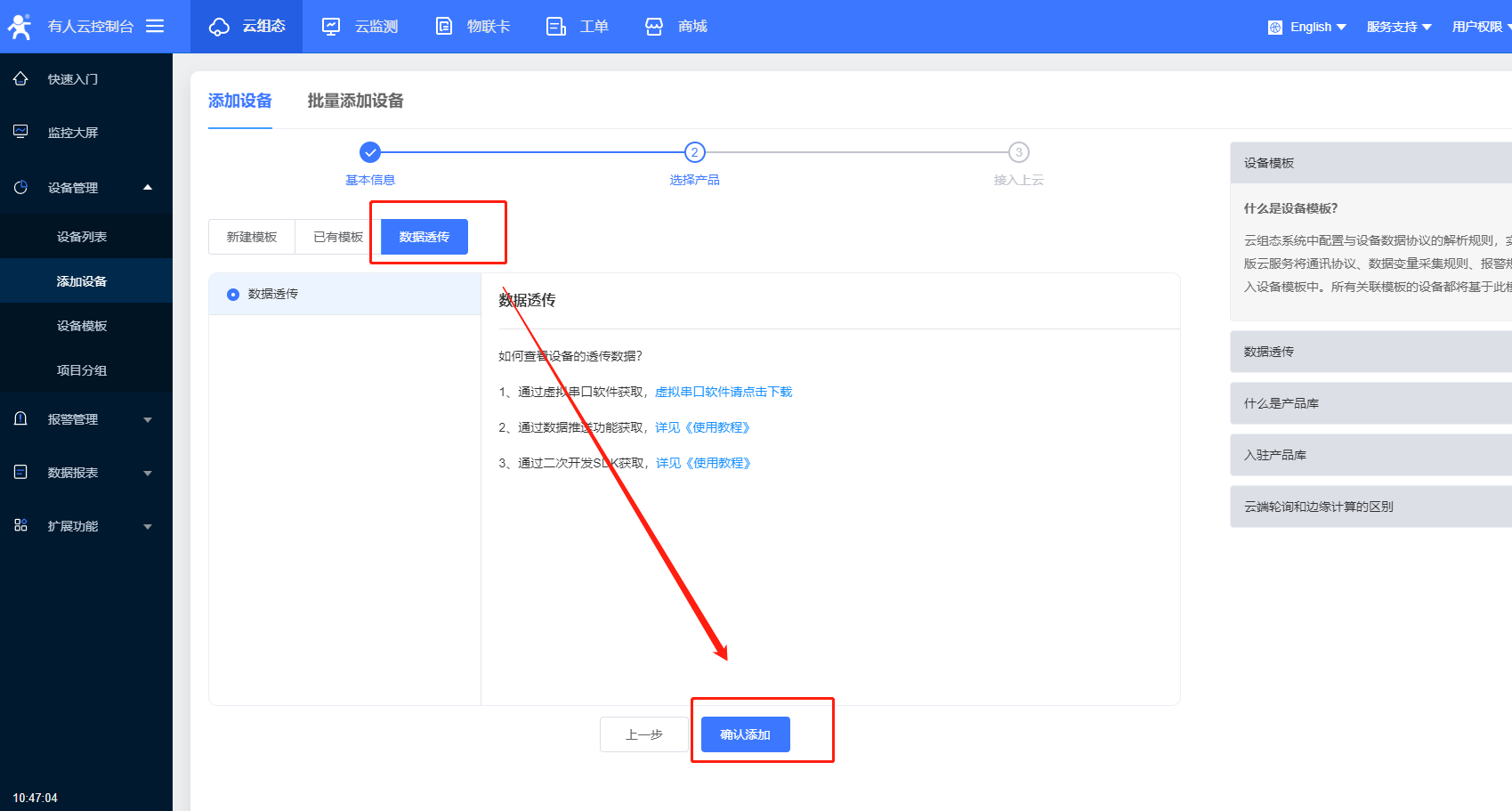 4.選擇數(shù)據(jù)透傳,點擊確認添加