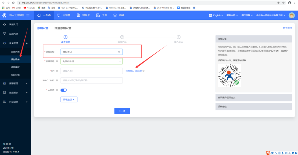 1.點擊添加設備,添加虛擬串口,點擊沒有SN,默認生成設備編號和密碼
