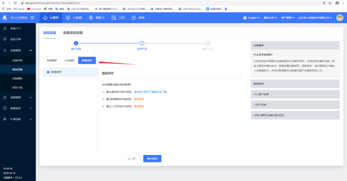 2.選擇數(shù)據(jù)透傳,點擊確認添加