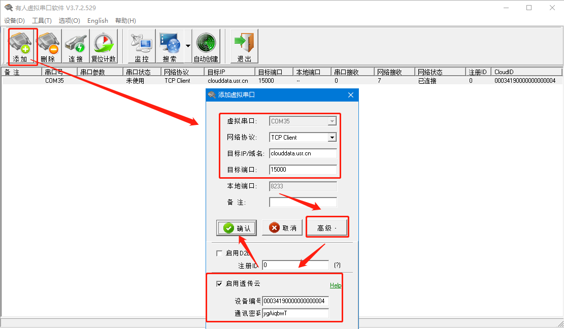 點擊高級,將云上生成的設備編號和密碼填入,點擊確定,生成虛擬串口
