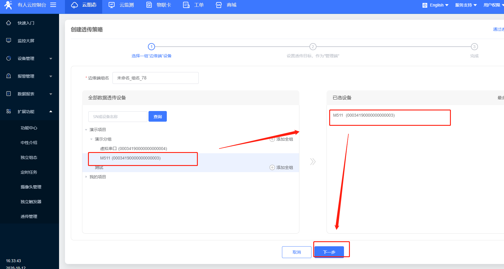 8.透傳策略自定義命名,先選擇透傳組一側(cè)的設備,選中,可看到右端出現(xiàn)選中的設備,點擊下一步
