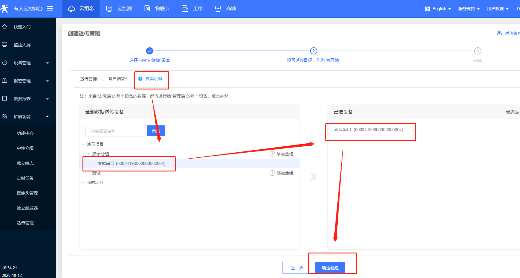 9. 先選擇真實設備,然后選中要透傳的設備,點擊確定創(chuàng)建