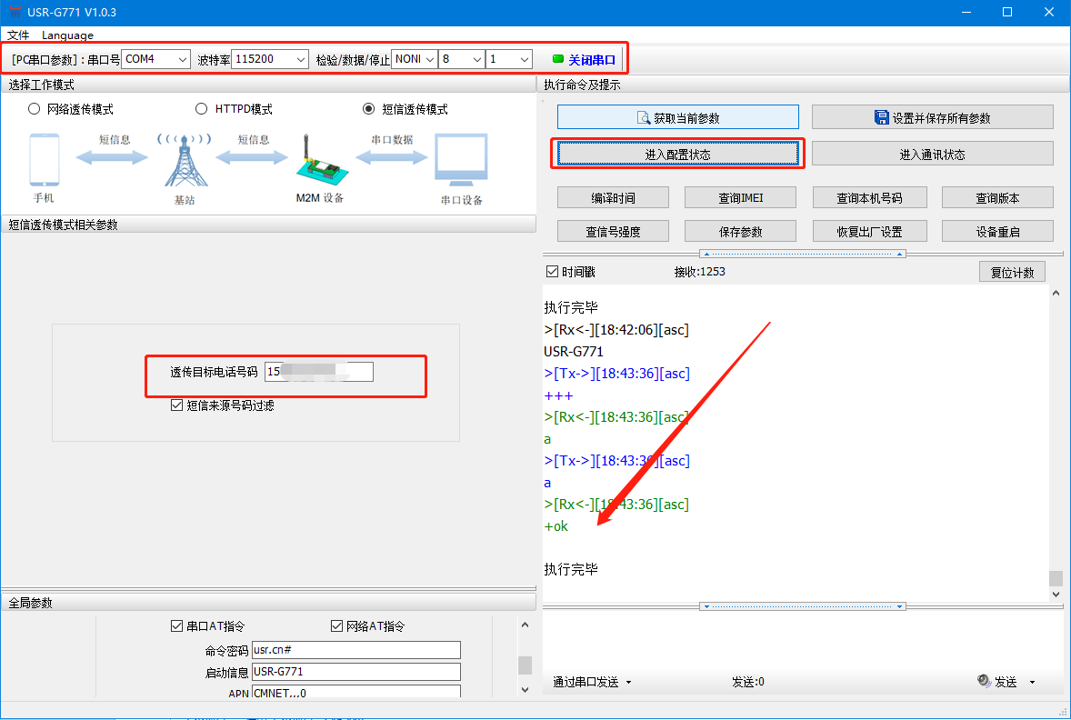 (2)打開串口——進(jìn)入配置狀態(tài)——設(shè)置工作模式為短信透?jìng)?,設(shè)置目標(biāo)手機(jī)號(hào)——設(shè)置并保存所有參數(shù)——串口打印開機(jī)信息說明設(shè)備重啟成功