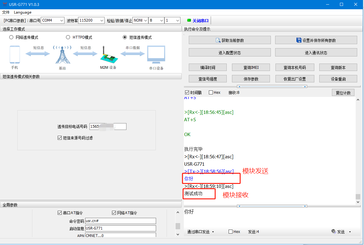 我們從目標(biāo)手機(jī)號(hào)發(fā)送數(shù)據(jù)“測(cè)試成功”,可以看到在模塊的串口端接收到了該數(shù)據(jù)