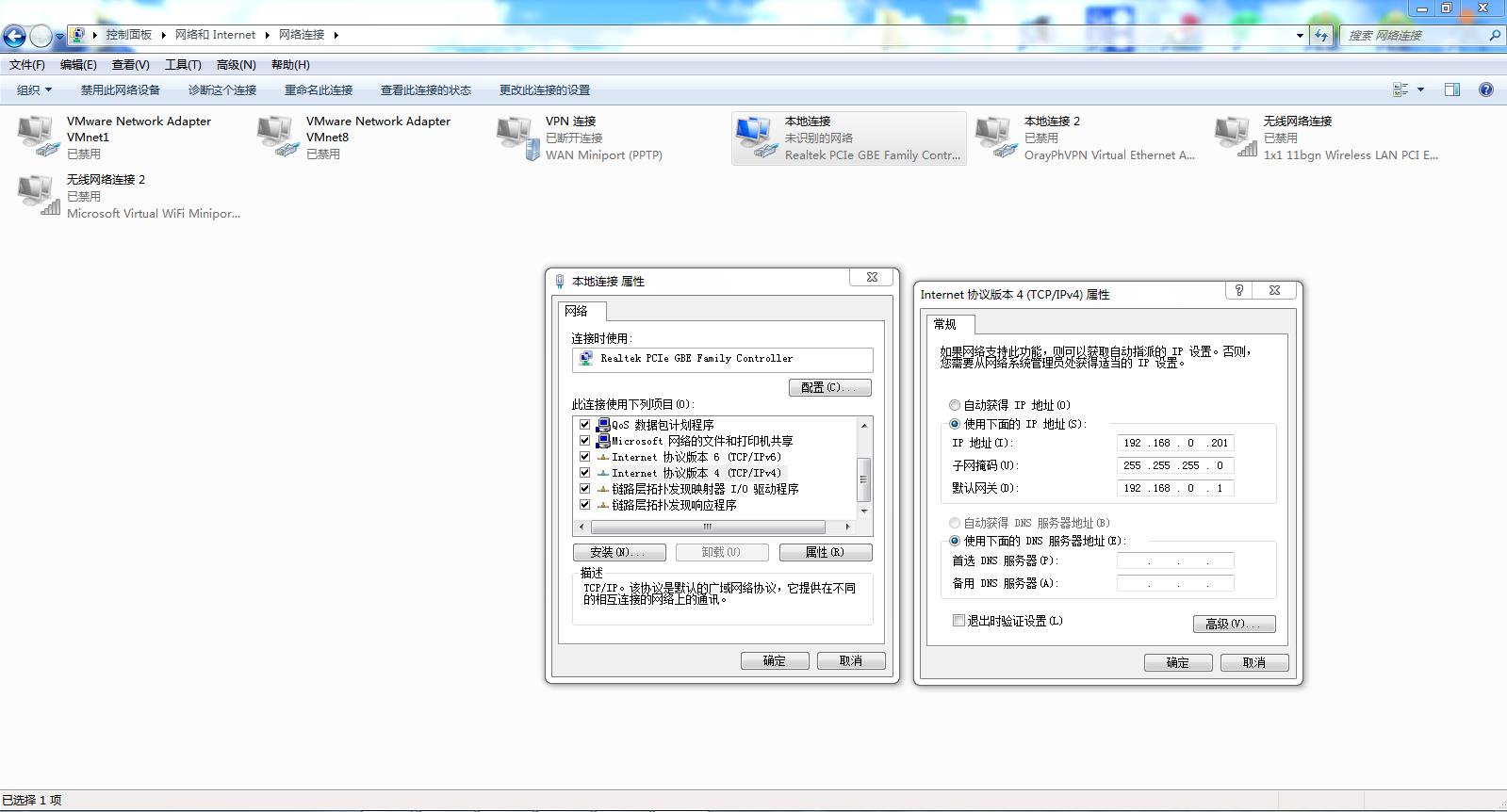 1)電腦本地連接,IP設(shè)置和410S IP同網(wǎng)段,410S默認IP是192.168.0.7,網(wǎng)關(guān)192.168.0.1,電腦本地連接IPv4設(shè)置靜態(tài)IP,192.168.0.201,子網(wǎng)掩碼255.255.255.0,網(wǎng)關(guān)192.168.0.1