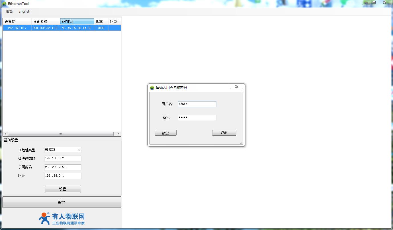 用H7系列配置軟件搜索410S設(shè)備,搜索IP 192.168.0.7之后,點擊IP,會彈出登錄框。