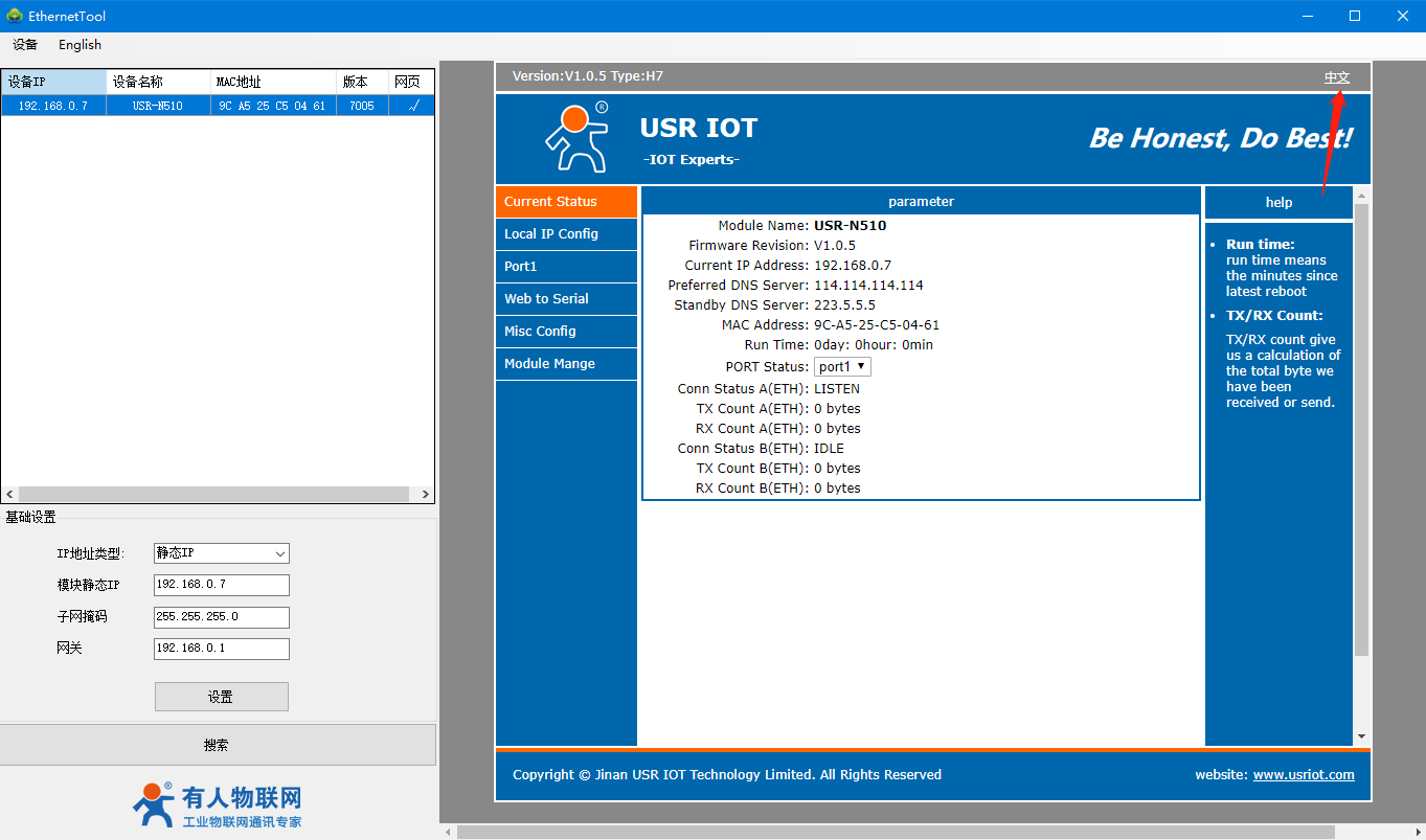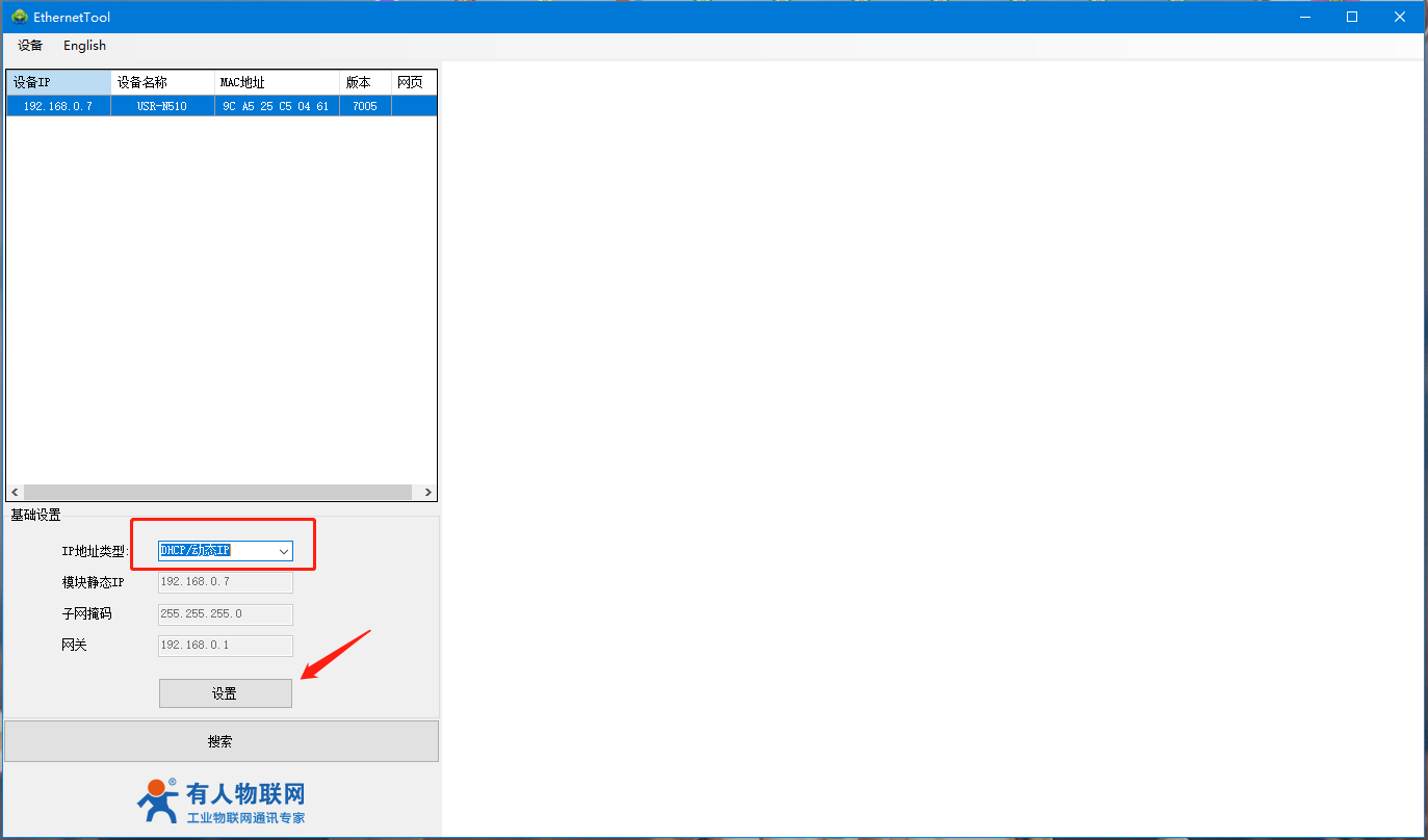4、打開510(H7)系列設(shè)置軟件,點擊搜索設(shè)備,可以搜索到510,并且可以看到目前510的相關(guān)信息,IP為192.168.0.7(默認),設(shè)備名稱為:USR-N510,MAC地址為:9C A5 25 XX XX XX,版本為:7005。