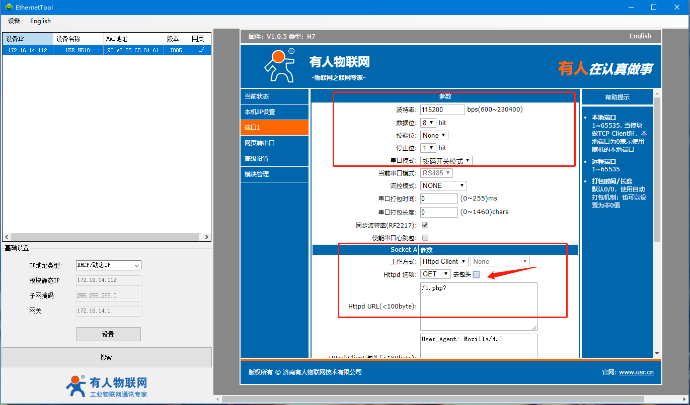 7、在端口1處,確認當前串口參數(shù)(默認為115288,N,8,1)以及串口模式(網(wǎng)頁設(shè)置優(yōu)先級大于撥碼開關(guān)),默認為撥碼開關(guān)模式,所以我們需要將設(shè)備的撥碼撥到相應(yīng)位置,設(shè)置模塊工作方式:HTTP client,HTTPD選項設(shè)置為GET,點擊去包頭,最后我們獲取到的數(shù)據(jù)將不會存在包頭,URL為:/1.php? 。