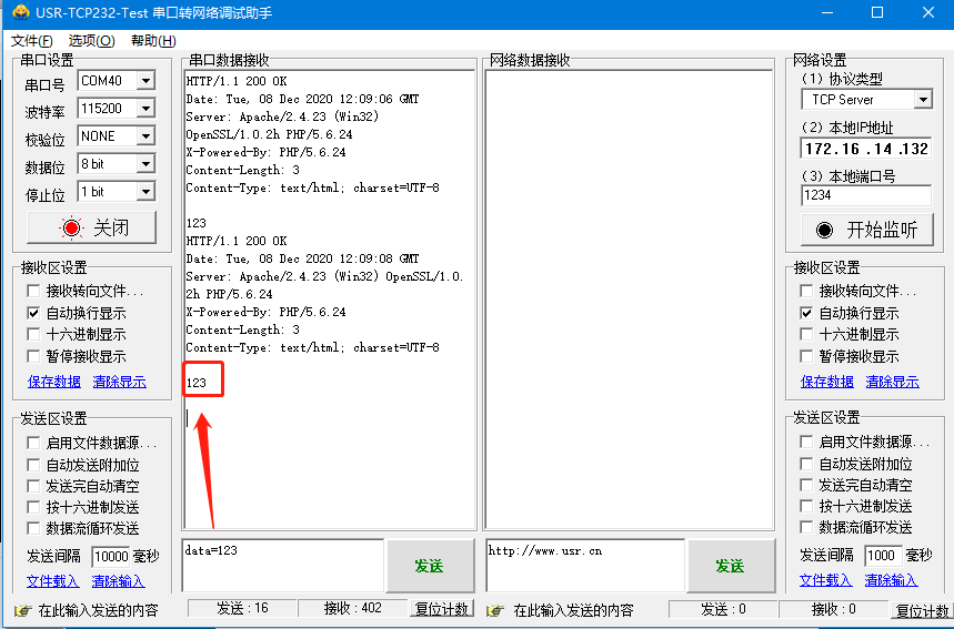 發(fā)送data=123,收到返回數(shù)據(jù)123