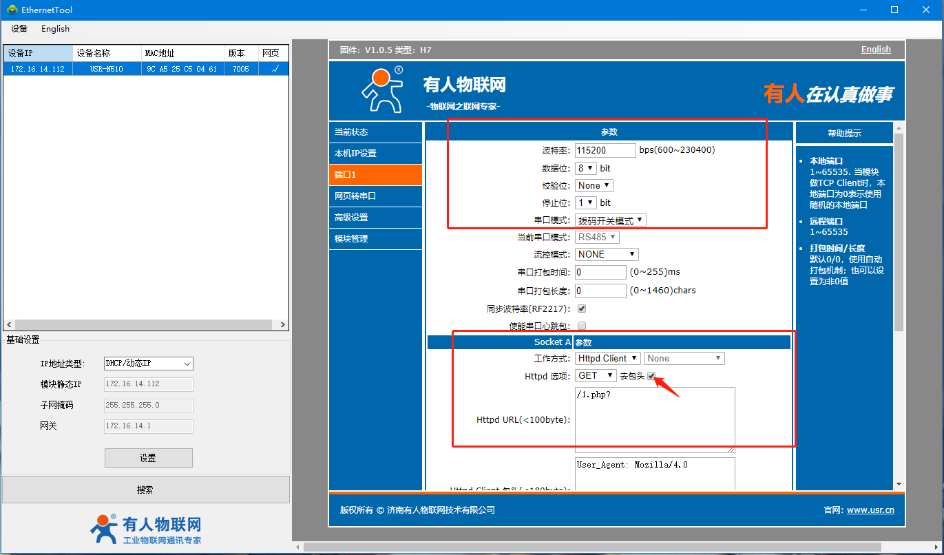 7、在端口1處,確認當前串口參數(shù)(默認為115288,N,8,1)以及串口模式(網(wǎng)頁設(shè)置優(yōu)先級大于撥碼開關(guān)),默認為撥碼開關(guān)模式,所以我們需要將設(shè)備的撥碼撥到相應(yīng)位置,設(shè)置模塊工作方式:HTTP client,HTTPD選項設(shè)置為POST,點擊去包頭,最后我們獲取到的數(shù)據(jù)將不會存在包頭,URL為:/2.php? 。