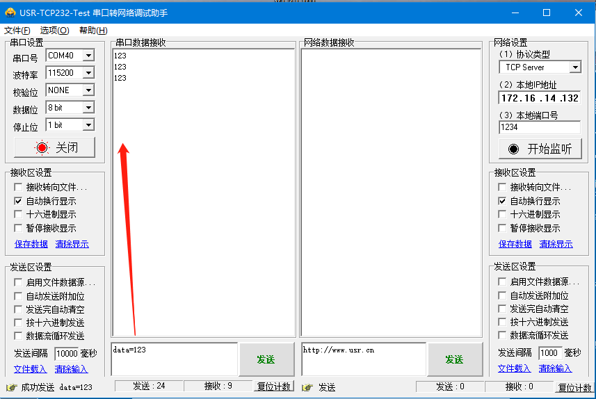 發(fā)送123,收到返回數(shù)據(jù):包頭+123