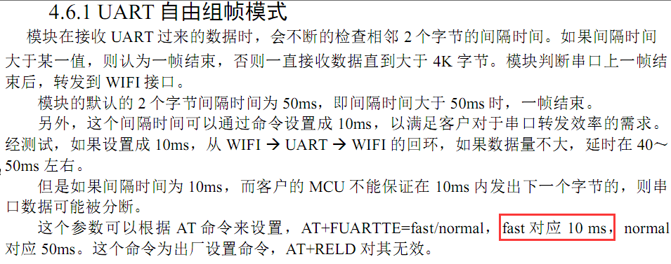 發(fā)送AT+FUARTTE=fast。 然后再發(fā)送AT+RELD使指令生效,注:改指令需要恢復(fù)出廠設(shè)置才能生效,設(shè)置完成支持請(qǐng)重新設(shè)置WiFi模塊的參數(shù)。