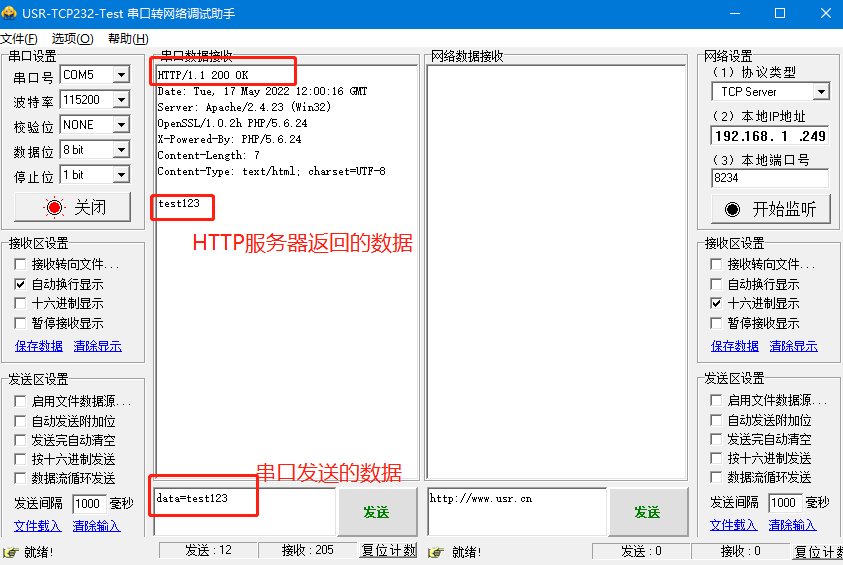打開串口調(diào)試助手,通過串口發(fā)送test123,能夠收到http服務(wù)器的返回,因?yàn)樵贕806s上沒有勾選過濾頭信息,所以服務(wù)器返回的頭信息我們在串口也可以看到。