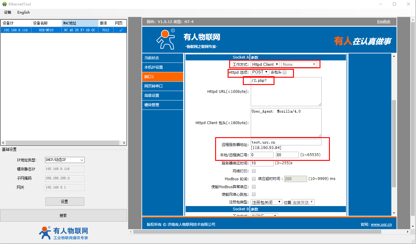 N510端口1工作方式設(shè)置HTTPD模式,POST,遠(yuǎn)程服務(wù)器地址填test.usr.cn,遠(yuǎn)程端口填80,本地端口號設(shè)置為0。URL填/2.php?,不濾除報(bào)頭。