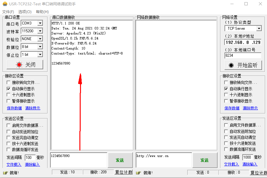 打開串口網(wǎng)絡(luò)助手,串口參數(shù)和N510 端口1參數(shù)保持一致,串口發(fā)送數(shù)據(jù)1234567890,測試服務(wù)器返回?cái)?shù)據(jù)。