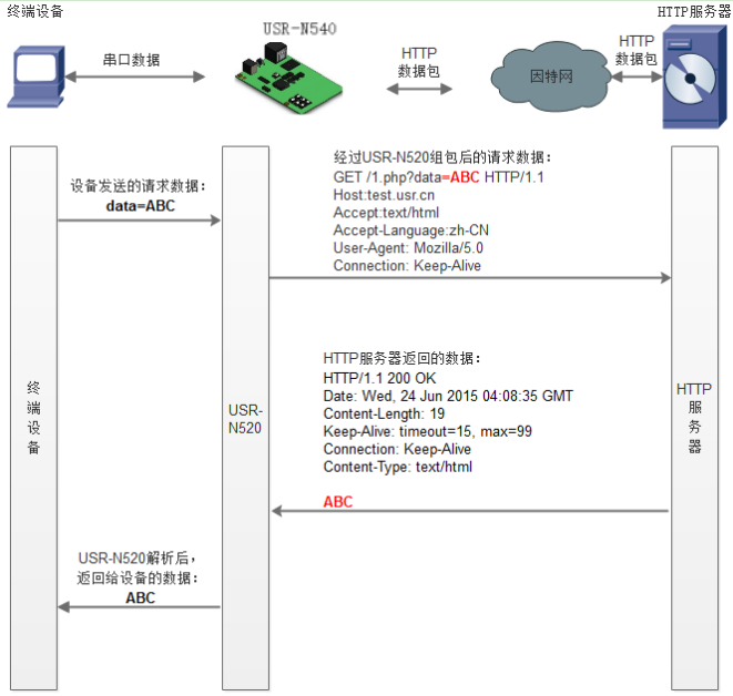 N540端口1工作方式設(shè)置HTTPD模式,GET,遠(yuǎn)程服務(wù)器地址填test.usr.cn,遠(yuǎn)程端口填80,本地端口號(hào)設(shè)置為0。URL填/1.php?,不濾除報(bào)頭。