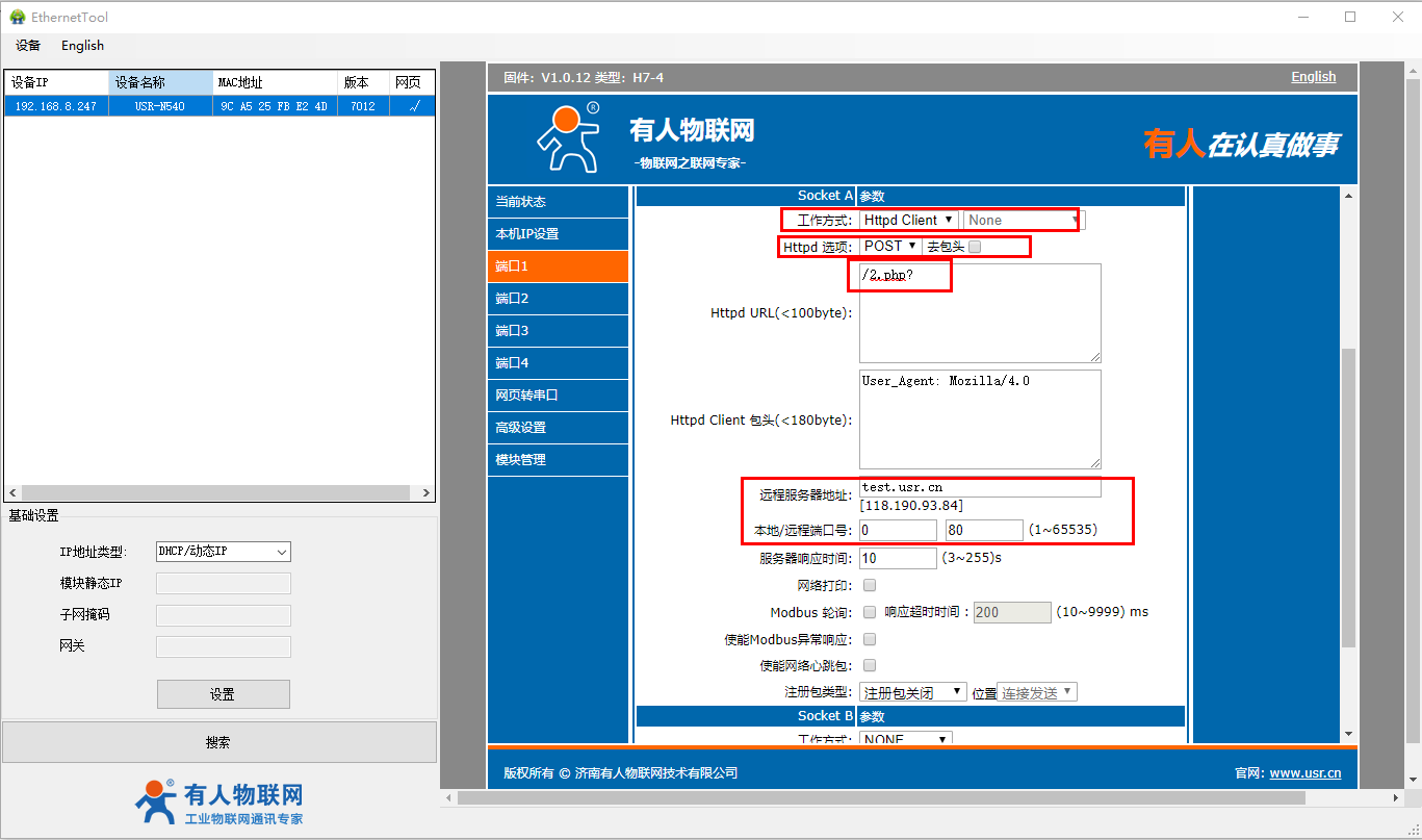 N540端口1工作方式設(shè)置HTTPD模式,POST,遠(yuǎn)程服務(wù)器地址填test.usr.cn,遠(yuǎn)程端口填80,本地端口號(hào)設(shè)置為0。URL填/2.php?,不濾除報(bào)頭。