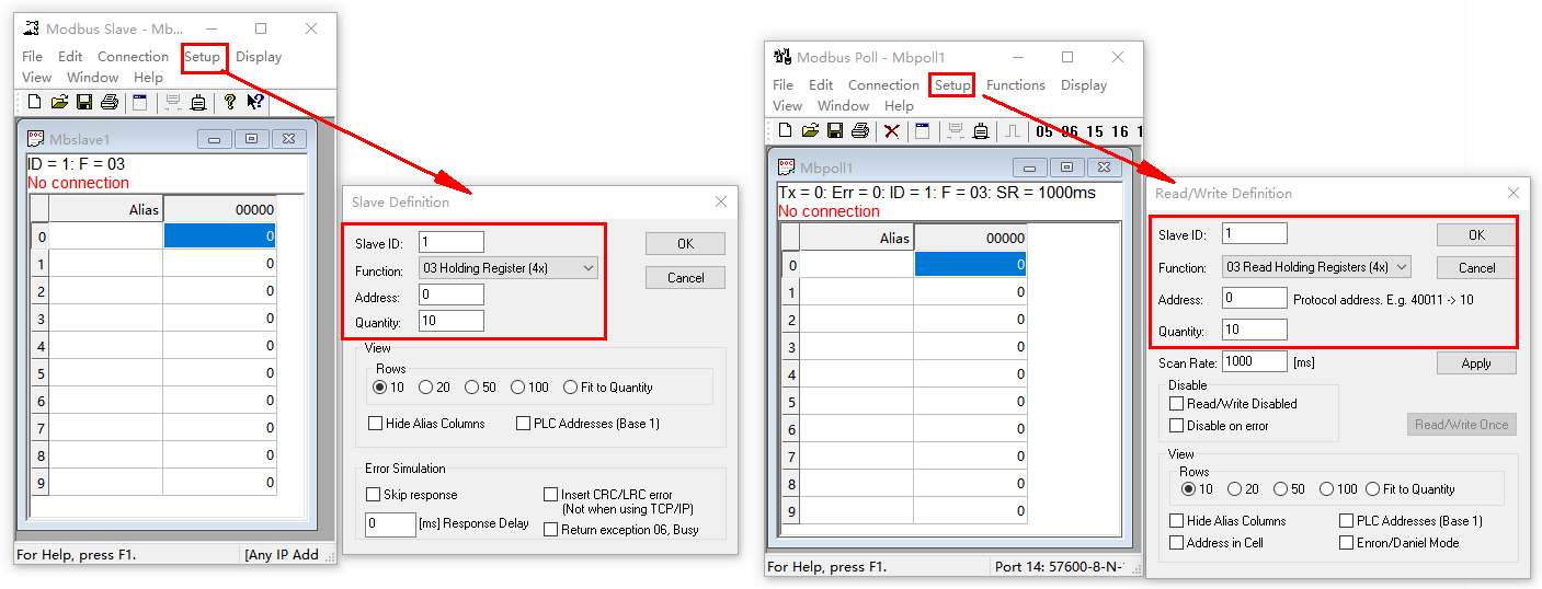2、MODBUS SLAVE和MODBUS POLL軟件設(shè)置: