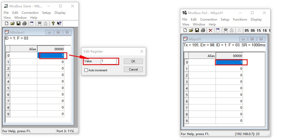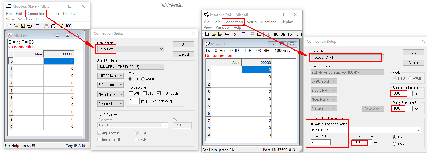 模擬測試用MODBUS SLAVE軟件做串口設(shè)備,用MODBUS POLL軟件做網(wǎng)絡(luò)端。