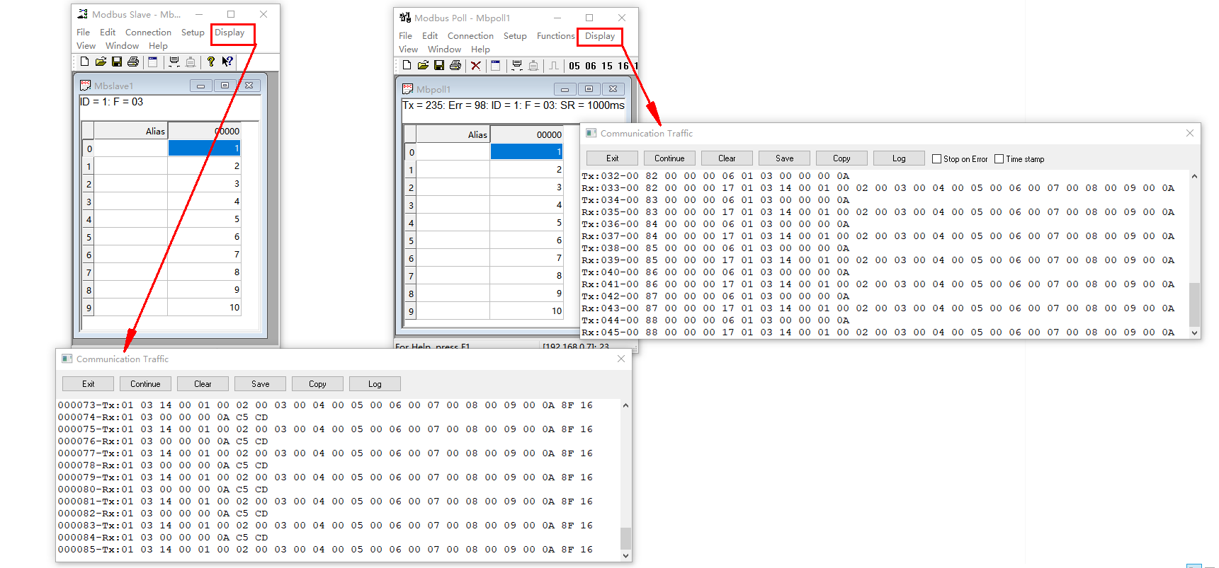 備注:MODBUS SLAVE軟件和MODBUS POLL軟件的選項Display,點開之后,最下面的Communication Traffic,是兩個軟件數(shù)據(jù)監(jiān)控,可以查看MODBUS 數(shù)據(jù),是否正常。