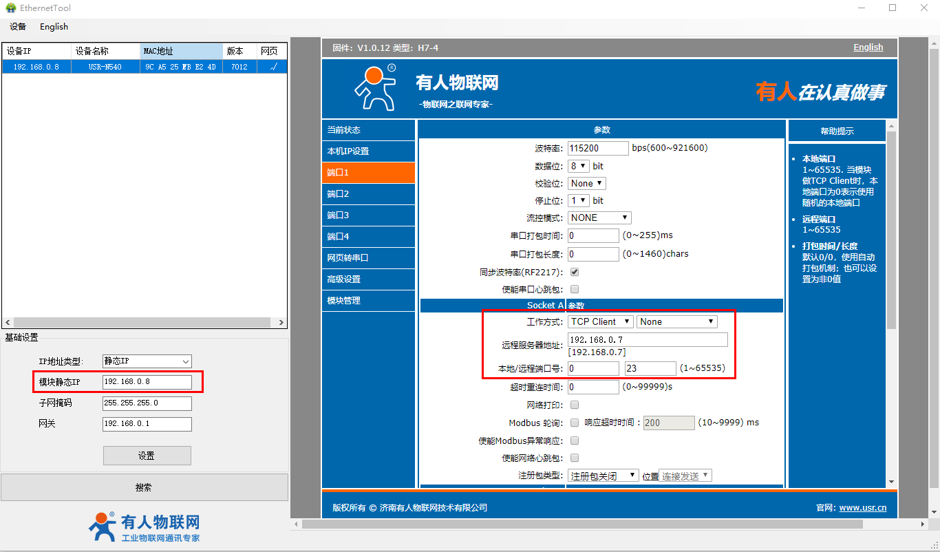 工作方式設(shè)置TCP client,遠(yuǎn)程服務(wù)器地址填192.168.0.7,遠(yuǎn)程端口填23。本地端口填0。