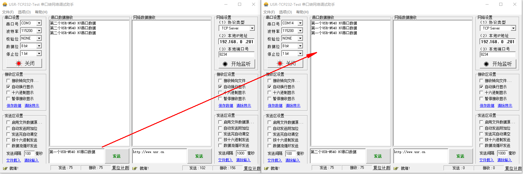 兩個(gè)N540的2個(gè)網(wǎng)口用一根網(wǎng)線直連,兩個(gè)N540的串口分別接USB-RS485串口線接電腦,打開2個(gè)串口助手,對應(yīng)各自N540串口參數(shù)。
