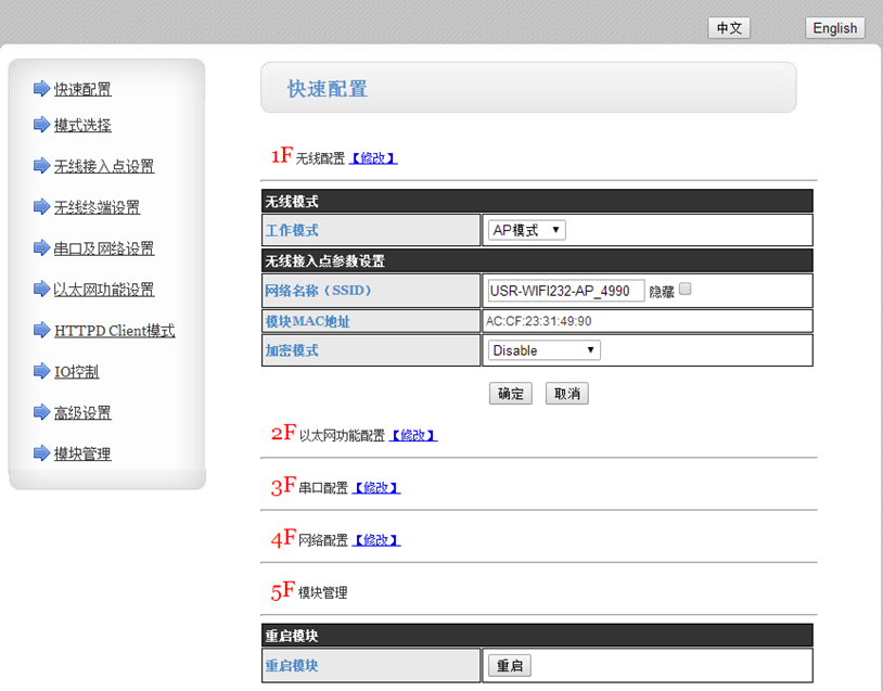 1:快速配置頁(yè)面,可以完成最基本的配置,AP配置,STA連接網(wǎng)絡(luò)配置,網(wǎng)絡(luò)協(xié)議配置等快捷配置。