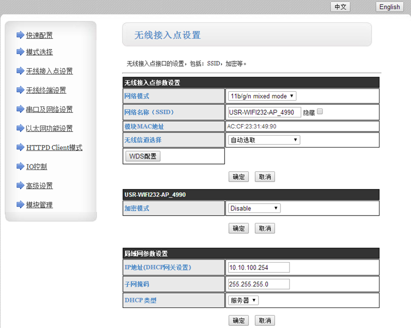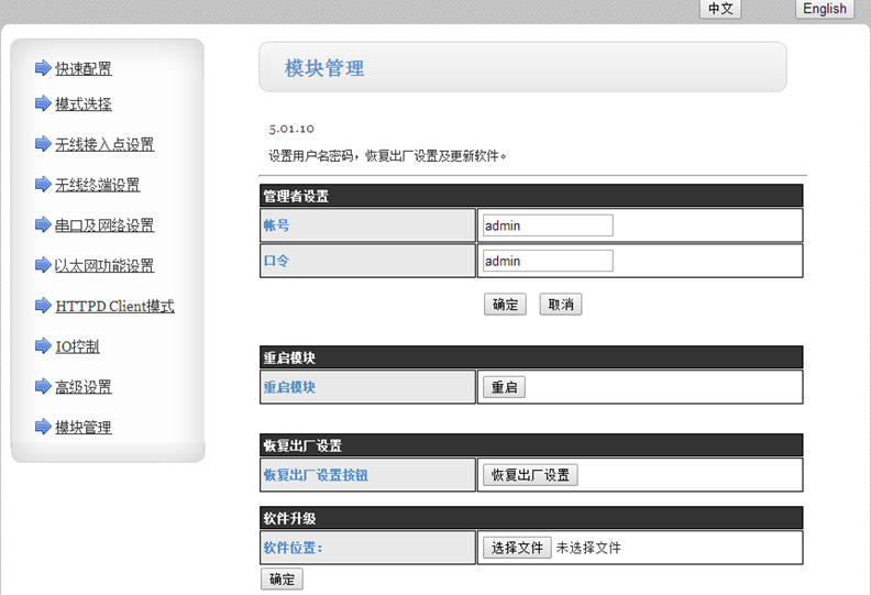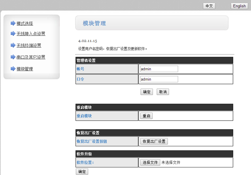 模塊在AP模式下默認(rèn)IP是10.10.100.254.在瀏覽器上輸入此IP。用戶名和密碼都是admin。