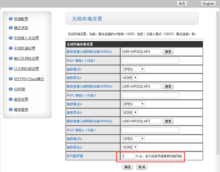 可以設(shè)置信號(hào)臨界值,用于切換SSID,切換方式是根據(jù)信號(hào)臨界值切換,SSID1消失了,自動(dòng)切換到SSID2,SSID2信號(hào)消失,自動(dòng)切換到SSID3,以排序的方式切換。如果信號(hào)臨界值設(shè)置為100就代表不切換SSID,默認(rèn)為連接SSID1.