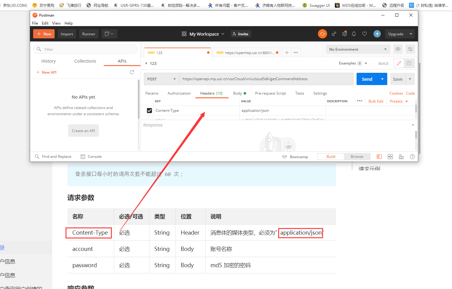 8、在headers中添加Content-Type和token,值分別為application/json以及剛剛獲取到的token